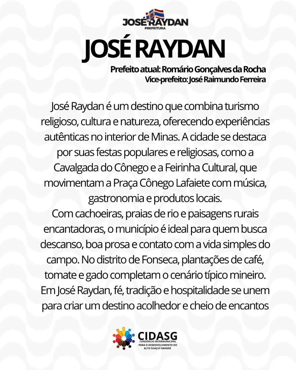 José Raydan é um destino que combina turismo religioso, cultura e natureza, oferecendo experiências autênticas no interior de Minas. A cidade se destaca por suas festas populares e religiosas, como a Cavalgada do Cônego e a Feirinha Cultural, que movimentam a Praça Cônego Lafaiete com música, gastronomia e produtos locais.
