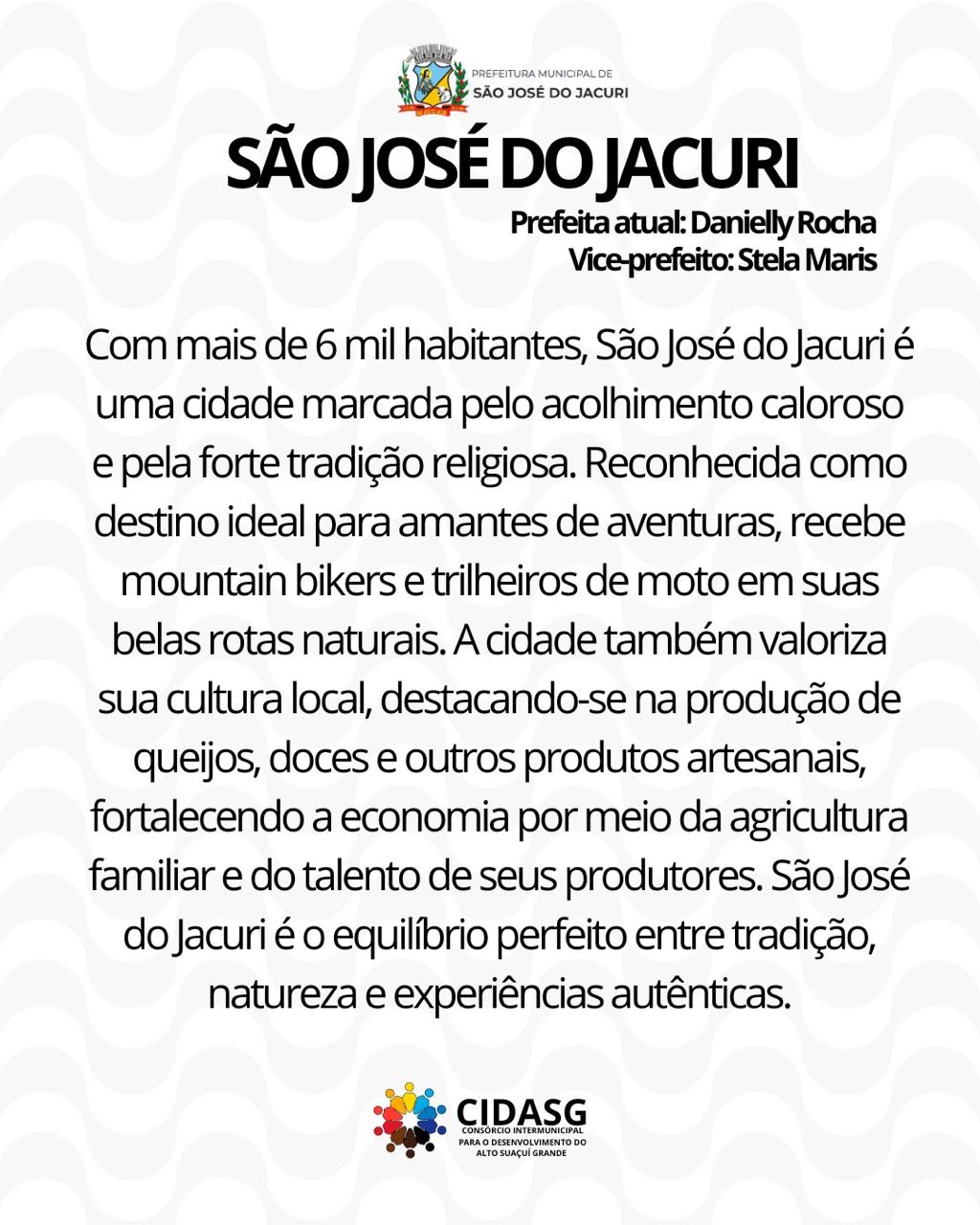 Com mais de 6 mil habitantes, São José do Jacuri é uma cidade marcada pelo acolhimento caloroso e pela forte tradição religiosa. Reconhecida como destino ideal para amantes de aventuras, recebe mountain bikers e trilheiros de moto em suas belas rotas naturais. A cidade também valoriza sua cultura local, destacando-se na produção de queijos, doces e outros produtos artesanais, fortalecendo a economia por meio da agricultura familiar e do talento de seus produtores. São José do Jacuri é o equilíbrio perfeito entre tradição, natureza e experiências autênticas.