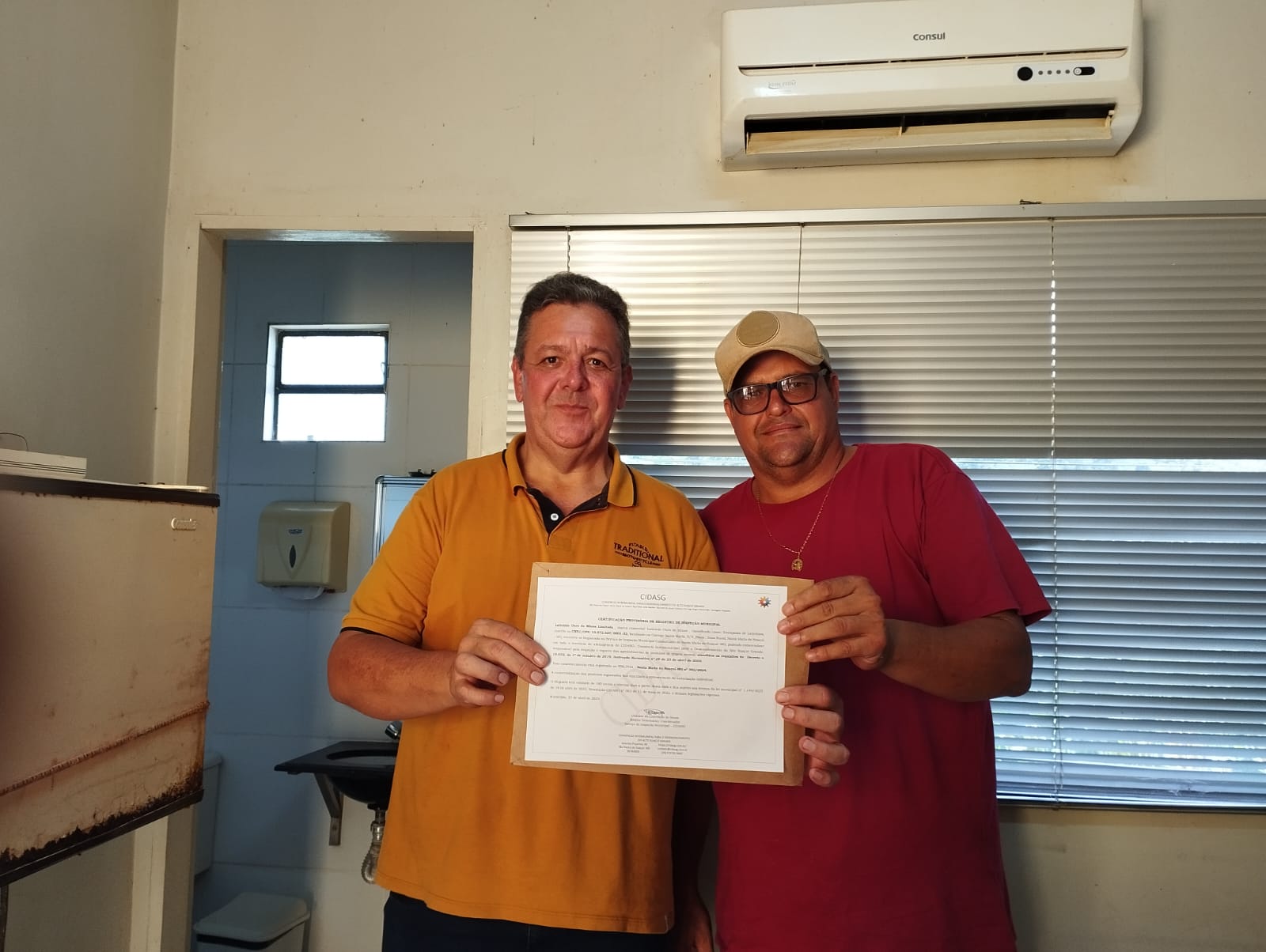 Abel Camilo e Luciano Soares proprietários da agroindústria Laticínios Ouro de Minas, segundos produtores a receber o Selo de Inspeção Municipal (SIM) concedido pelo Consórcio Intermunicipal do Alto Suaçuí Grande (CIDASG), através da Médica Veterinária Uideane Souza, representando um significativo avanço para a regularização e valorização dos produtos de origem animal em nossa região.