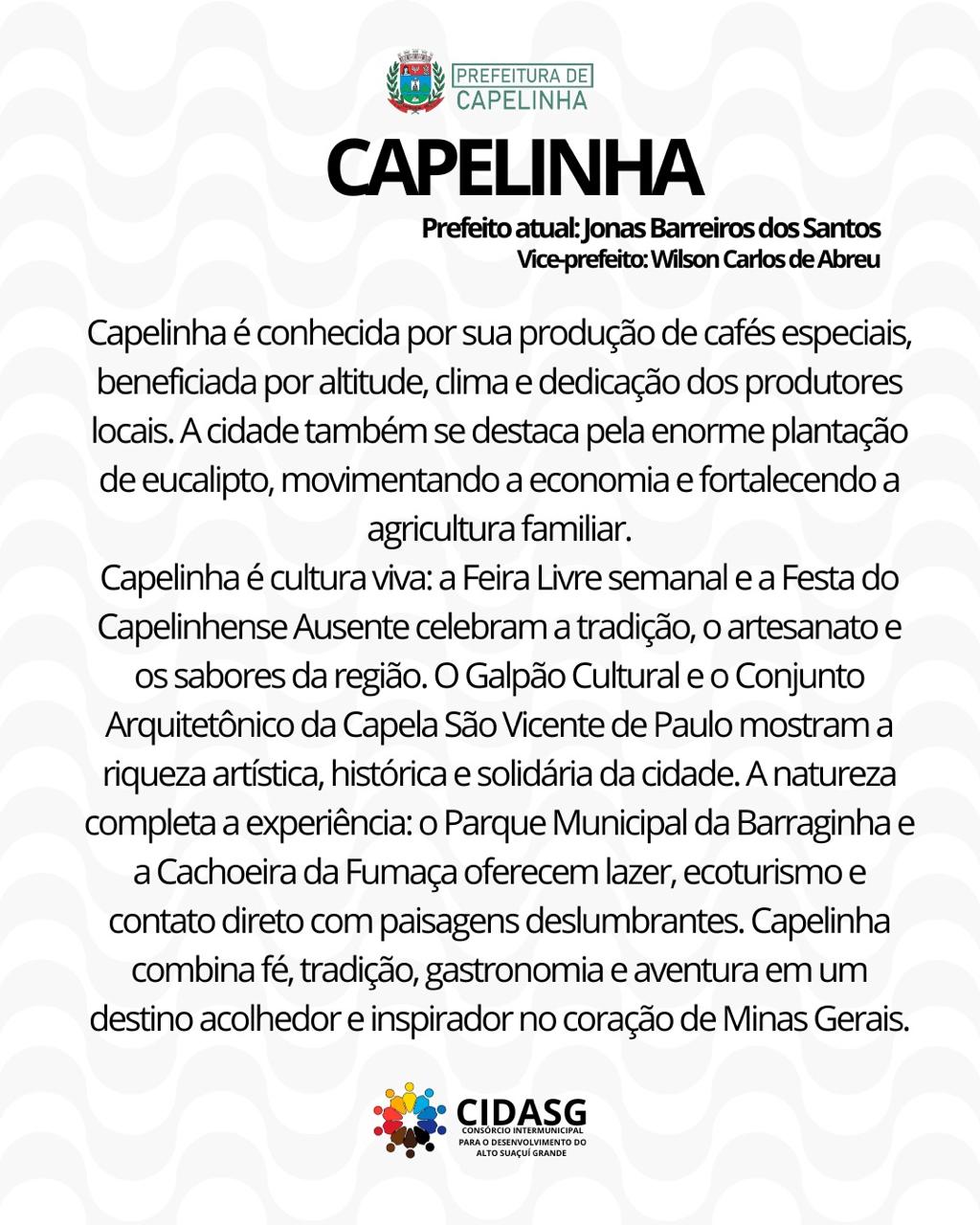 Capelinha é cultura viva: a Feira Livre semanal e a Festa do Capelinhense Ausente celebram a tradição, o artesanato e os sabores da região. O Galpão Cultural e o Conjunto Arquitetônico da Capela São Vicente de Paulo mostram a riqueza artística, histórica e solidária da cidade. A natureza completa a experiência: o Parque Municipal da Barraginha e a Cachoeira da Fumaça oferecem lazer, ecoturismo e contato direto com paisagens deslumbrantes. Capelinha combina fé, tradição, gastronomia e aventura em um destino acolhedor e inspirador no coração de Minas Gerais.